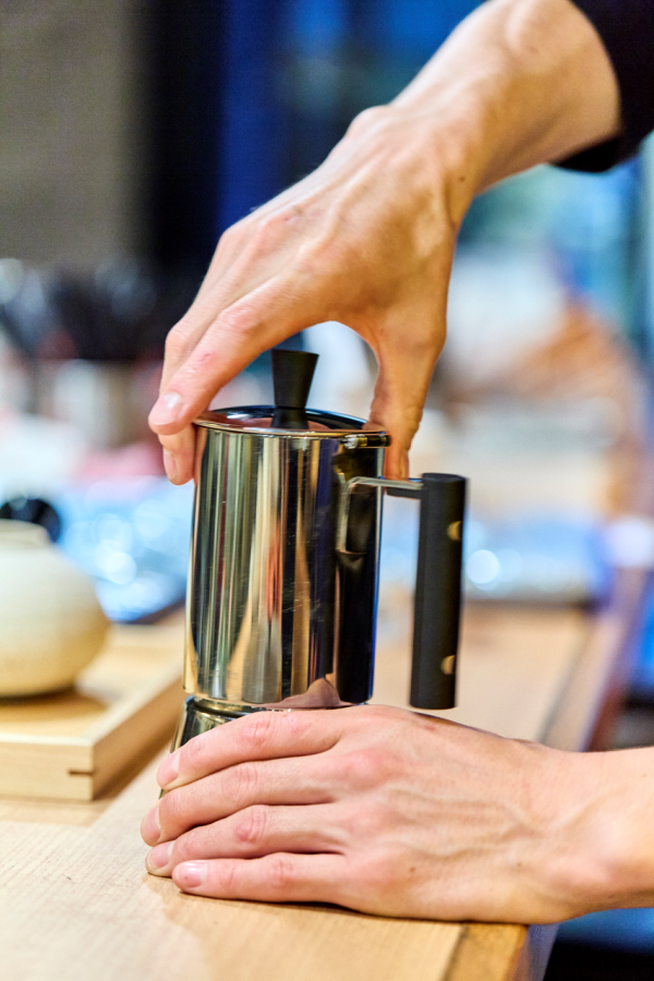 いい塩梅にほうじ茶の茶葉ができたら、いったんお店の方が引き上げて、お湯を注いでくれます。そこで登場するのが直火式のエスプレッソメーカー「マキネッタ」。