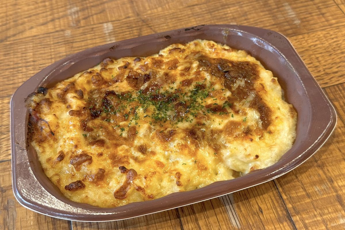 国産タマネギや牛乳などを使用し、ナツメグを利かせたグラタンソースとジャガイモを絡め、その上から3時間以上煮込んだ牛ホホ肉と野菜のうま味が詰まったラグーソースと3種のチーズをかけて焼き上げた一品です。
