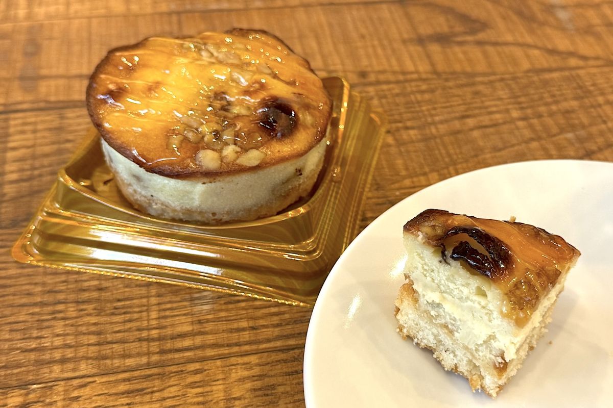 バターを使用したサクサク食感の塩クッキー生地の上にイチジクを並べ、その上からクリームチーズや卵、純生クリーム、イタリア産のゴルゴンゾーラチーズを使用したチーズケーキ生地を流し入れ、砕いたクルミをトッピングして焼き上げられています。最後にハチミツをかけて仕上げ。