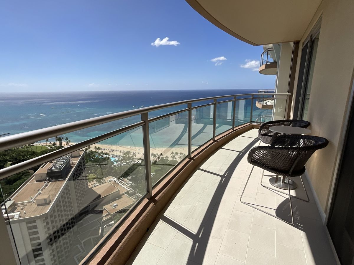 リビングルームには、ソファやダイニングテーブルが設けられ、開放的なバルコニーからはハワイの光と風を感じられます。朝は窓を開けて、波の音に耳を傾けながら一日の始まりを迎えるのも贅沢なひとときです。