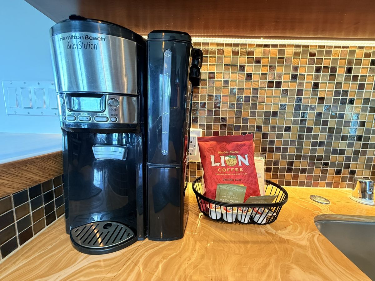 コーヒーメーカーにはライオンコーヒーが用意されており、朝のコーヒータイムも本格的に楽しめます。