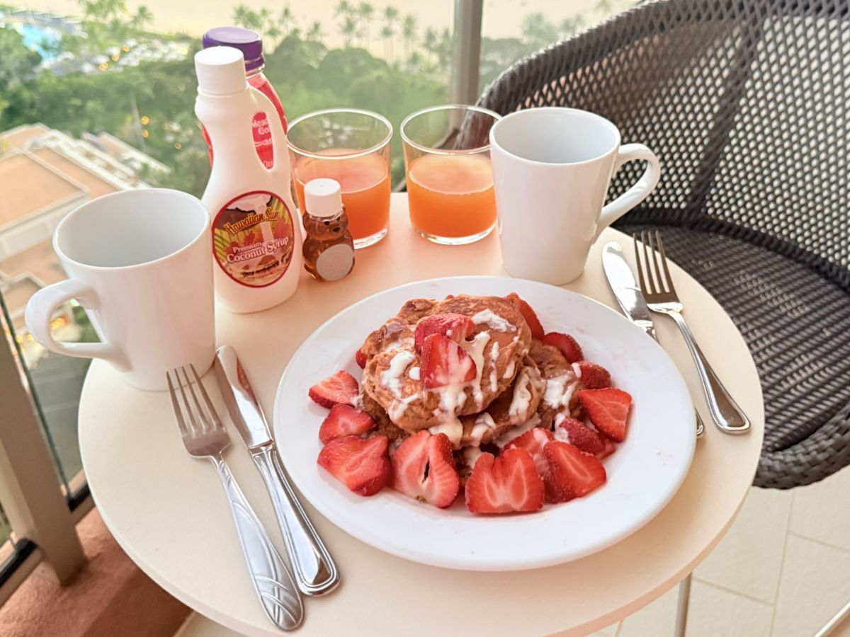 バルコニーで海を眺めながら、波の音を聞きつつ作りたてのパンケーキを味わえば、まるでカフェにいるかのような気分に。