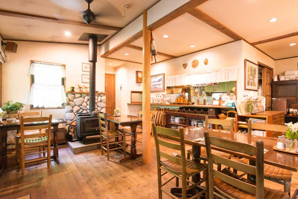 テラス席にばかり注目しがちですが、店内のインテリアも素敵です。木の質感をしっかりと生かしつつ、シックな暖炉が置かれたり、季節の野花が飾られたり、ゆっくりと朝食を楽しんでほしいというオーナー夫妻の気配りが感じられます。