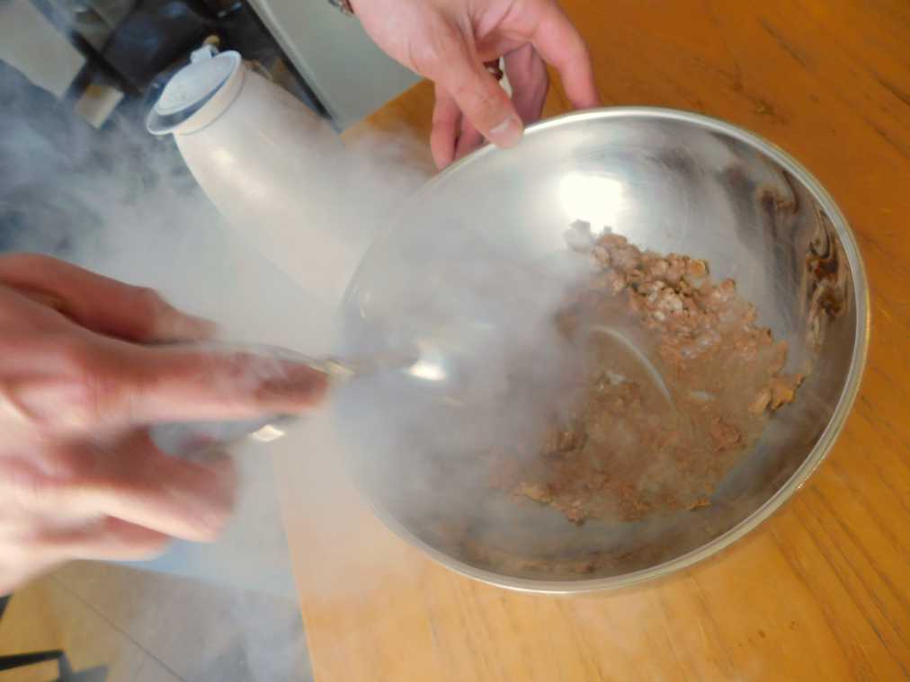 添えてあるチョコレートアイスは、お客さんの目の前で液体窒素を使って作ってくれます。できたてのアイスは、シャリシャリとしたやわらかさの残る凍り具合。さらにパイ生地も入っているので、サクサクの食感と相まってとても美味!アイスを目の前で作ってもらえるのは感激です!