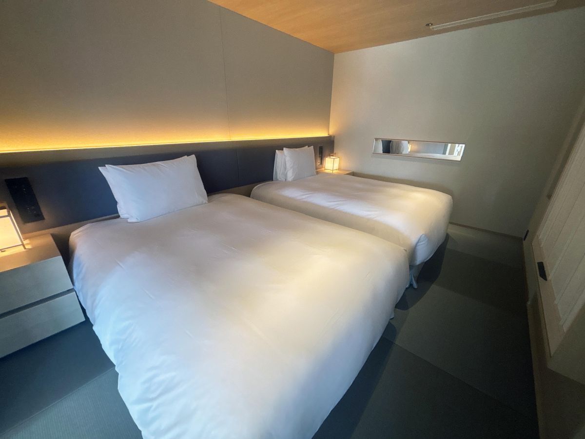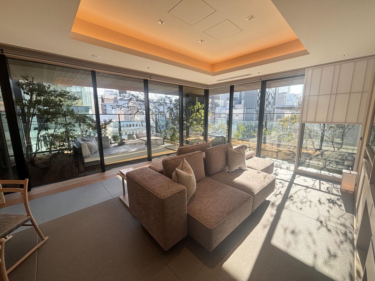 今回宿泊したのは、「ラグジュアリーコーナースイート」。大きな窓から柔らかな光が差し込む、和と洋が融合したスタイリッシュなお部屋です。