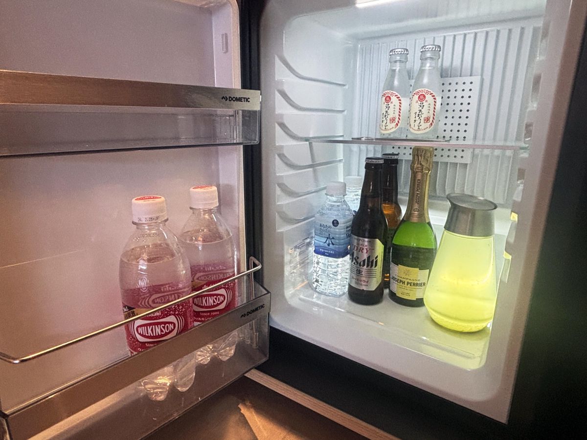 冷蔵庫には、炭酸水や緑茶、ビールなどフリードリンクが勢揃い。ラインナップには、お風呂上がりに飲みたいサイダーも!(※一部有料の飲み物もあり)