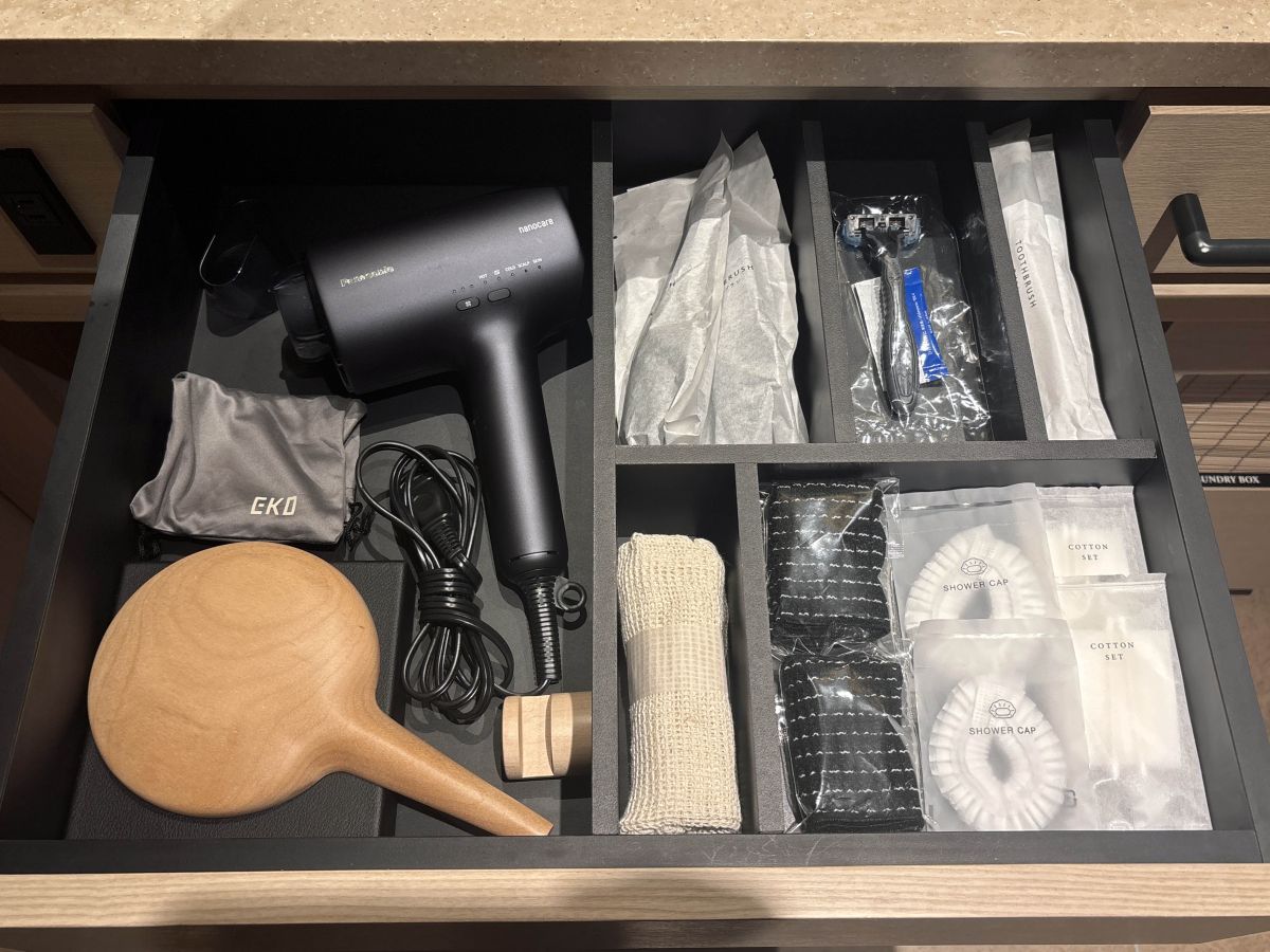 引き出しには歯ブラシやコットンセット、ヘアドライヤーなどアメニティーがぎっしり。基本的なアイテムはひととおり揃っています。