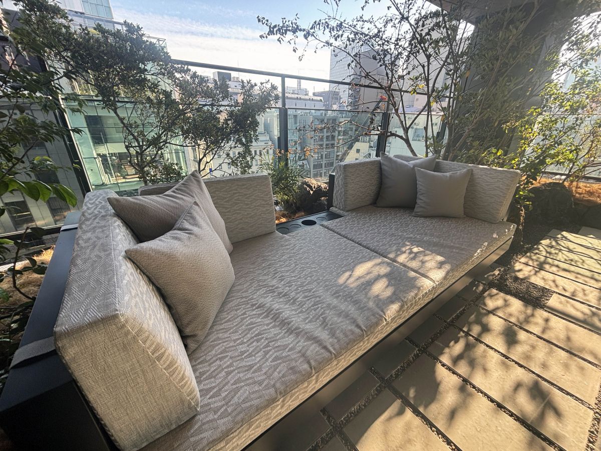 お風呂上がりのクールダウンにぴったりなのが、広々としたバルコニー。ふかふかのソファーに座れば、大都会の街並みを一望しながら心地よい風を感じることができます。