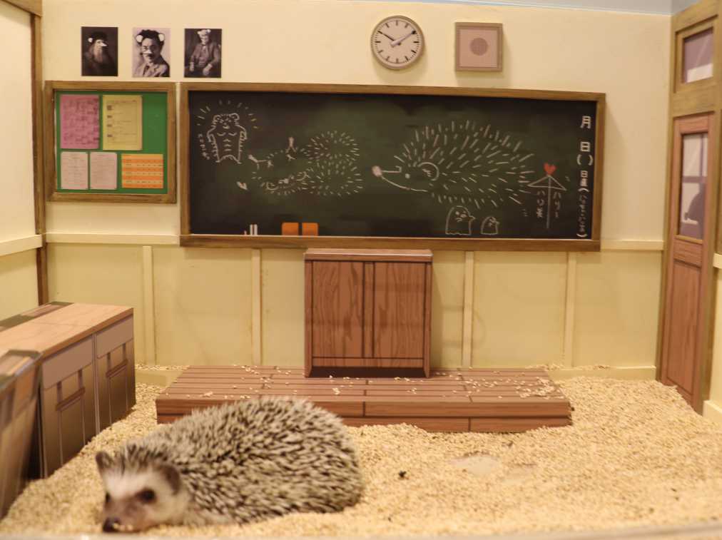 部屋には細部へのこだわりもたくさん。例えば、教室を再現したこちら。黒板にハリネズミの落書きや、偉人の写真もハリネズミ風に!それぞれの部屋をよく覗きこんでみてくださいね。