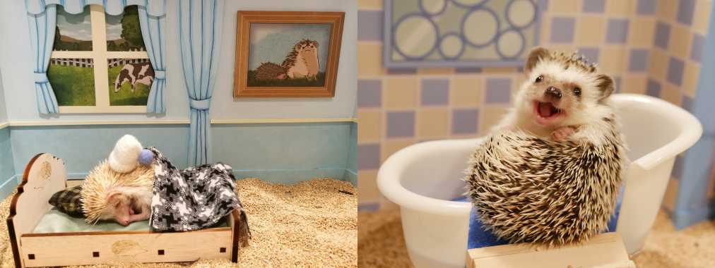 小物はすべてハリネズミサイズなので、ベッドに横たわったり、お風呂の中でくつろいだりと、まるで人間のように暮らす愛らしい姿が見られることも。人間に慣れているので、誰でも簡単にフォトジェニックな1枚が撮れること間違いなし!