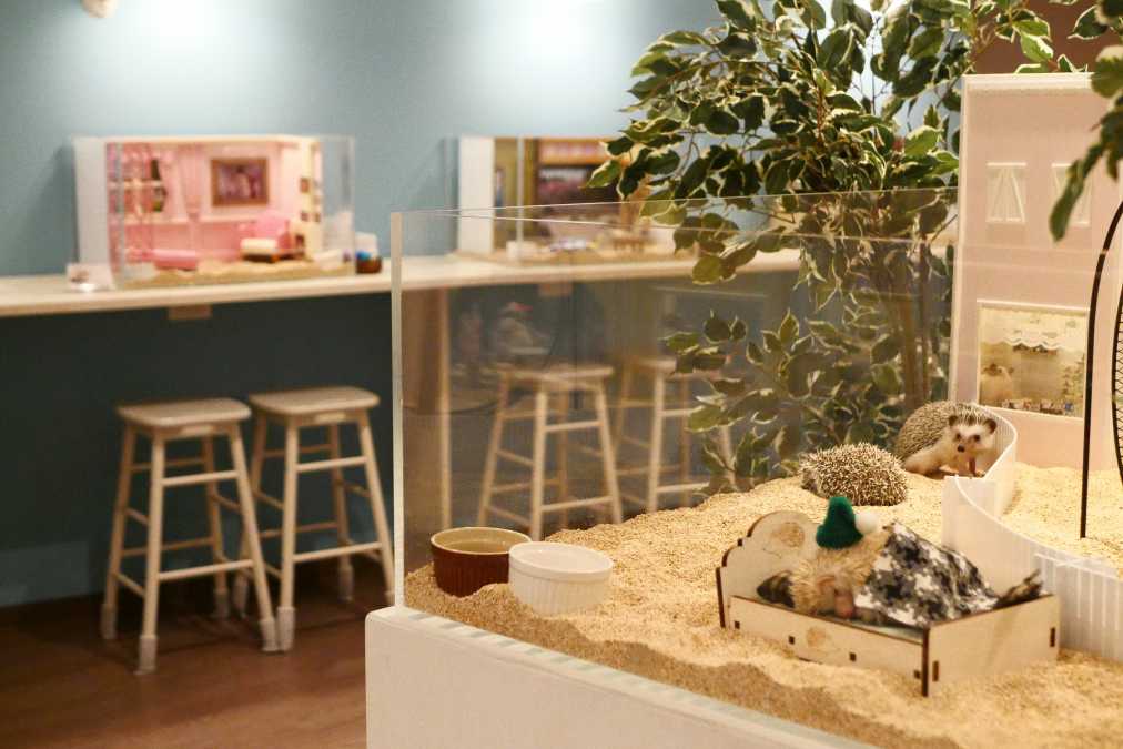 店内に入ると目を引くのが、ずらっと並んだ14個の可愛らしいドールハウス。実は、こちらハリネズミたちがまるでドールハウスで暮らしているように見える特注ゲージなんです。