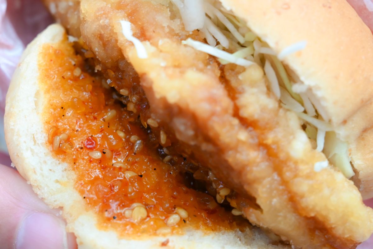 こちらは、「ケンタの鶏竜田バーガー」のおいしさに、特製ピリ辛生姜ソースがプラスされたバージョン。ピリ辛生姜ソースは下のバンズに塗られているので、かじったときに最初は鶏肉とマヨソースのおいしさを感じ、そのあとに徐々にピリ辛のうま味が広がっていきます。