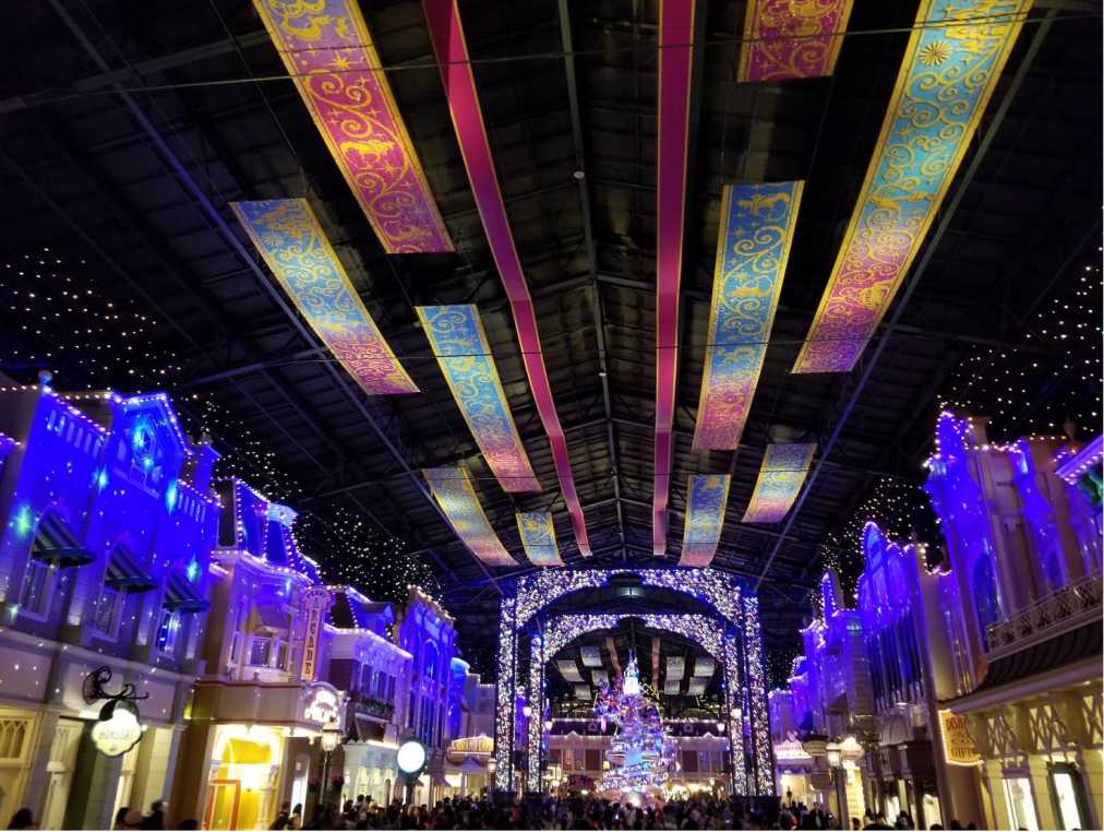 ワールドバザールのメインストリートがきらめく、セレブレーションストリートのナイトバージョン。幻想的な演出は感動的!最後にディズニーマジックをたっぷり楽しんで!