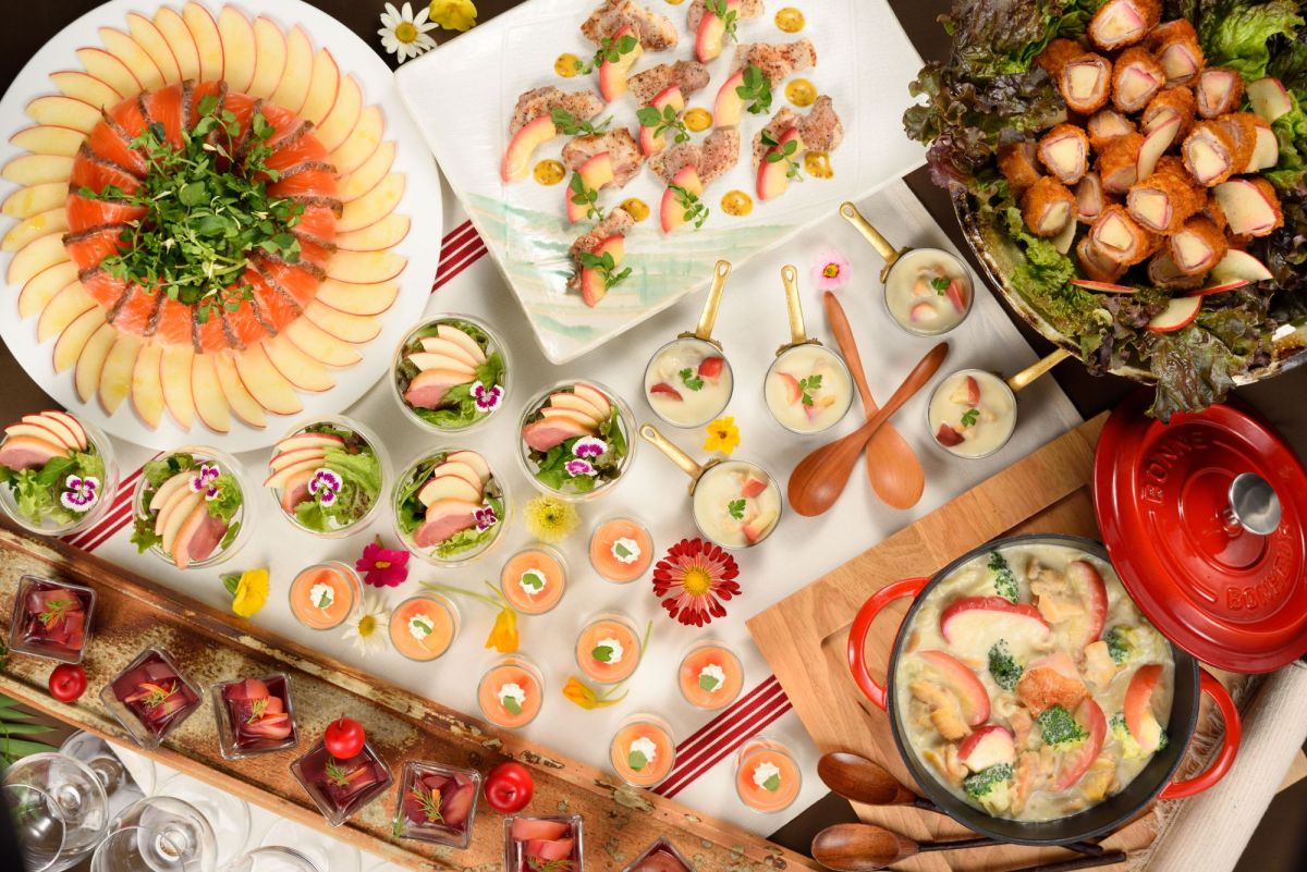 ビュッフェ台の1・2卓めは、りんごを使った前菜。「りんごのポテトサラダ」や「りんごと鮪のサラダ」など、りんごのおいしさを分かっているからこそできる料理が揃います。