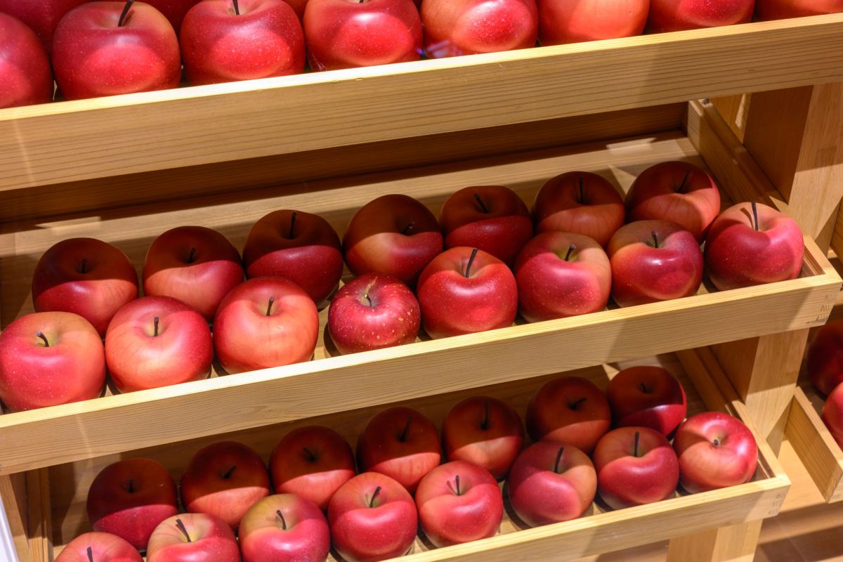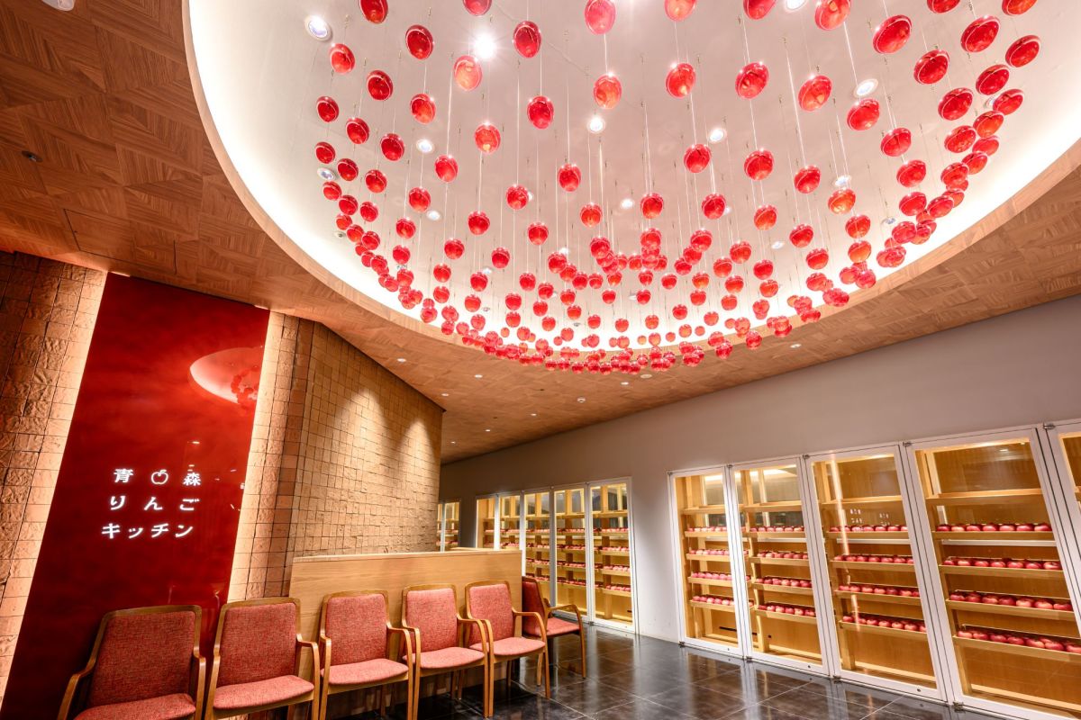 りんご型の津軽びいどろが何百と集まってできたシャンデリアや、ずらっと並んだりんごの棚がお出迎え。ちなみにりんごの棚は、毎日2個ずつ本物のりんごが紛れ込んでいるのだとか。