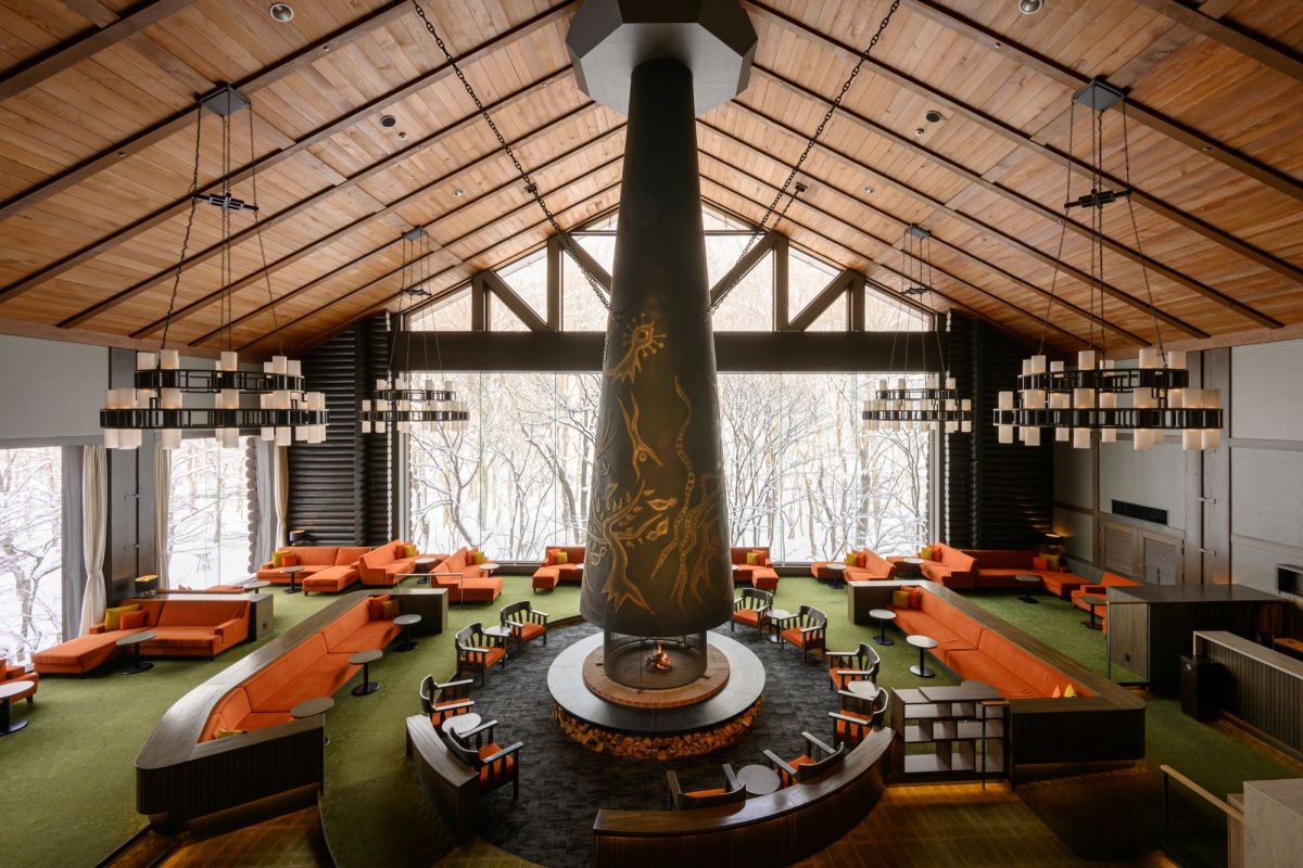 チェックインしたらまずはロビーで一息。中央にあるのは、このホテルのシンボルでもある岡本太郎作の大暖炉「森の神話」です。鳥やキノコ、森の妖精が暮らしている様子を表現した生命力あふれる作品で、この暖炉でくつろげるなんてすごく優雅…。