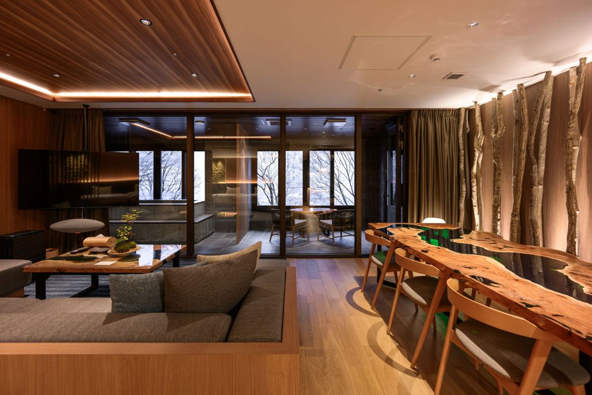 ちなみに「渓流スイートルーム」もちらり。定員6人まで、120㎡の開放的な空間。壁際に並ぶサクラやコブシの木が印象的で、部屋ごと森の中にいるような、渓流の自然を近くに感じられるお部屋です。