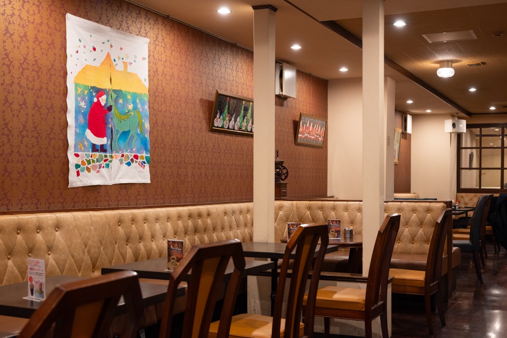 地元の人や観光客を中心に朝から賑わいを見せる店内は、創業当初の雰囲気をそのまま残したクラシカルな内装が印象的。呉服店を改装した広々とした空間には、ゆったりとしたソファ席やテーブル席が並びます。奥には禁煙席もあるため、お子さん連れも安心して利用できます。