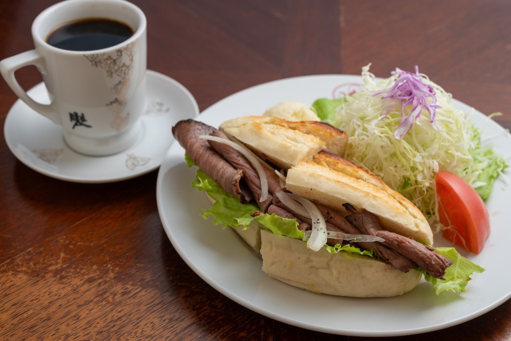 伝統を重んじる先代に対して、新しいことに挑戦するのが好きだという現社長。その革新的な姿勢は、多彩なフードメニューにもよく表れています。ふっくらとした歯切れのよいパンに、明治2年(1869)創業の牛肉専門店「モリタ屋」のローストビーフを挟んだ贅沢な「ローストビーフサンド」をはじめとする、カスクートシリーズもその一つ。「前田珈琲」のためだけに作られた特注のパンを使用する同シリーズは、現社長のアイデアから生まれた人気メニューです。