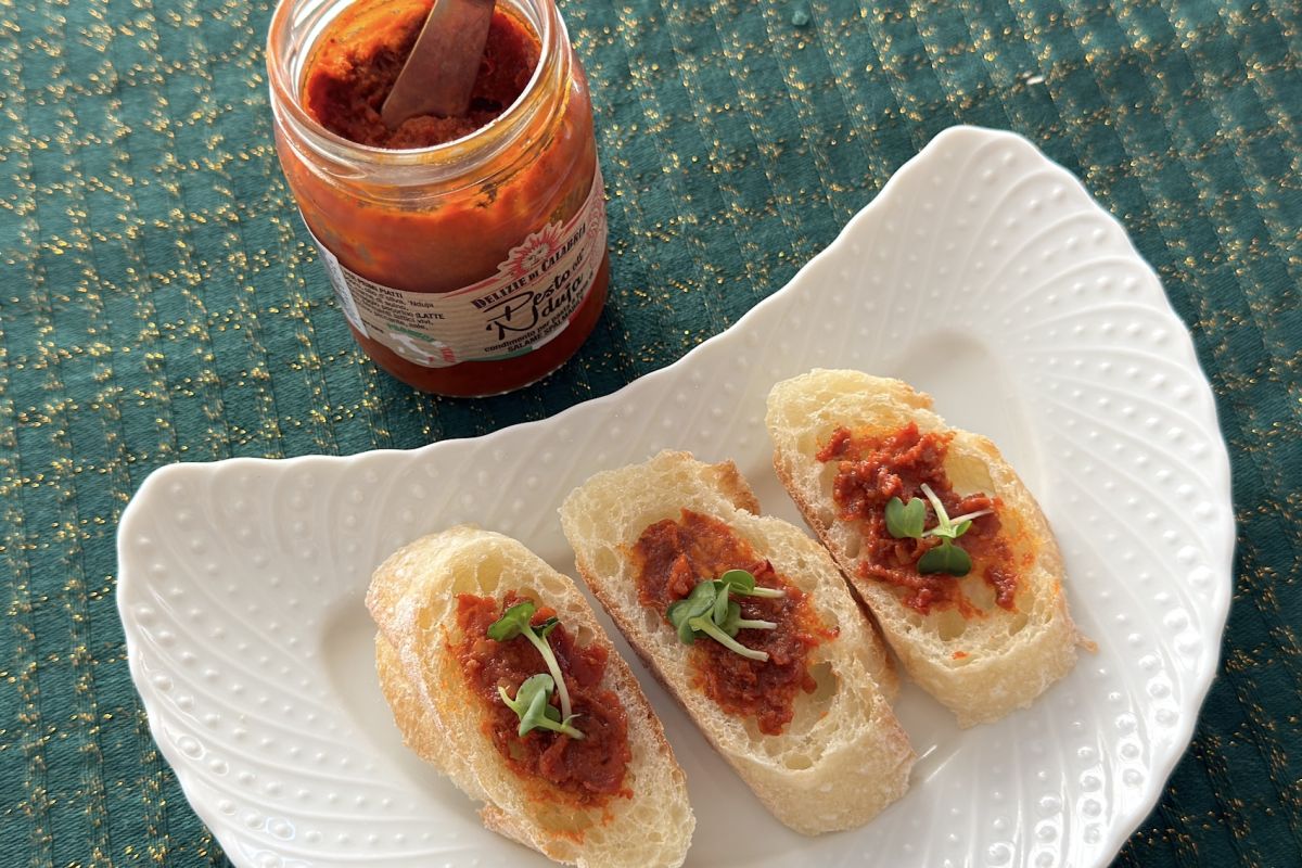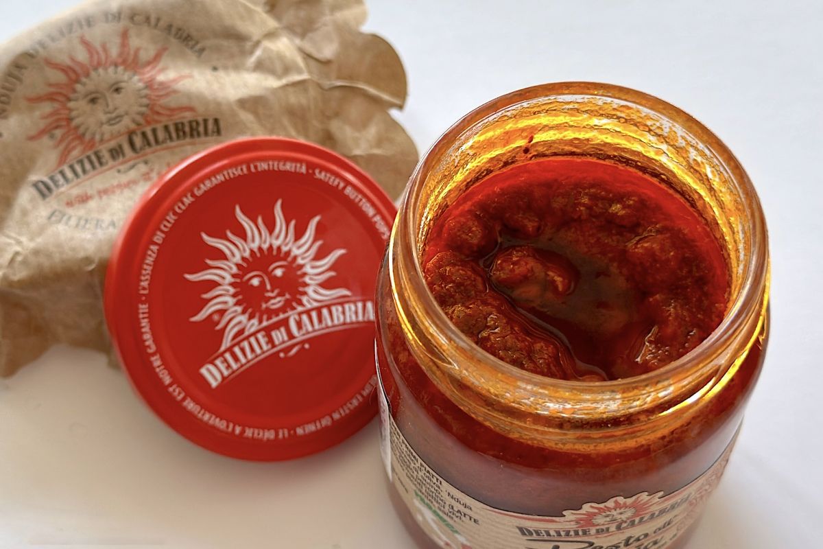 この商品は、唐辛子の辛味や豚肉のうま味を持つ「ンドゥーヤ」に、トマトやペコリーノチーズ、バジルやオレガノなどのハーブを合わせたペーストです。