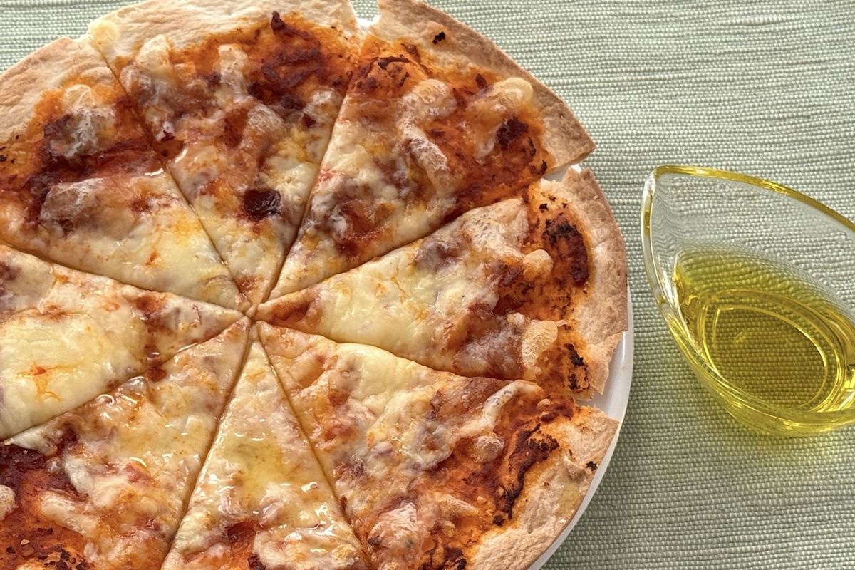 冷凍のピザ生地の上にペーストを薄く塗り、チーズをのせ、オーブントースターで焼きます。