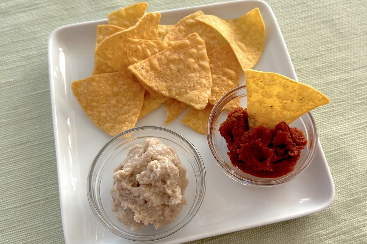 今回は同じくカルディコーヒーファームで買ったタコスチップスを添えました。コーントルティーヤを揚げたプレーンタイプで、香ばしく軽い食感が、それぞれのペーストの味を受け止め、引き立てます。