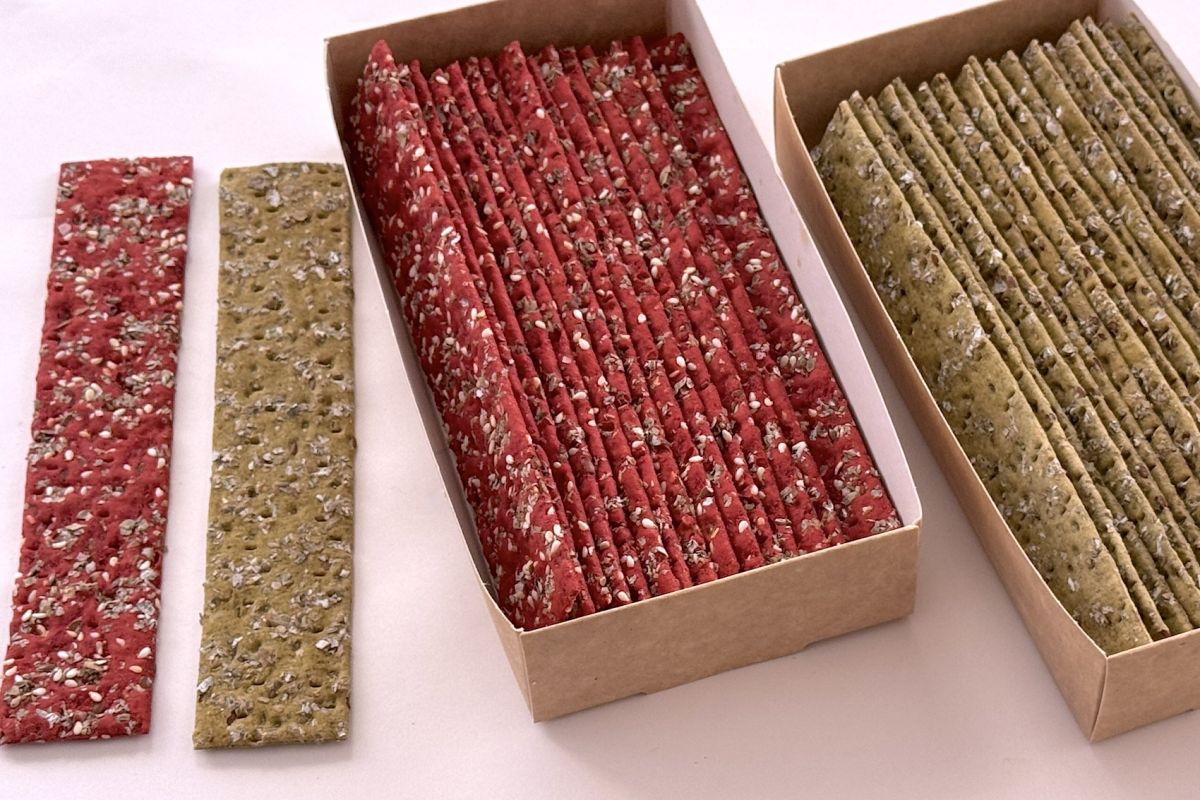 赤いビーツクラッカーは、ビーツパウダーとたっぷり入ったゴマの食感がポイント。緑のケールクラッカーは、ケールパウダーとオレガノやガーリック、塩味もきかせたおつまみ向き。