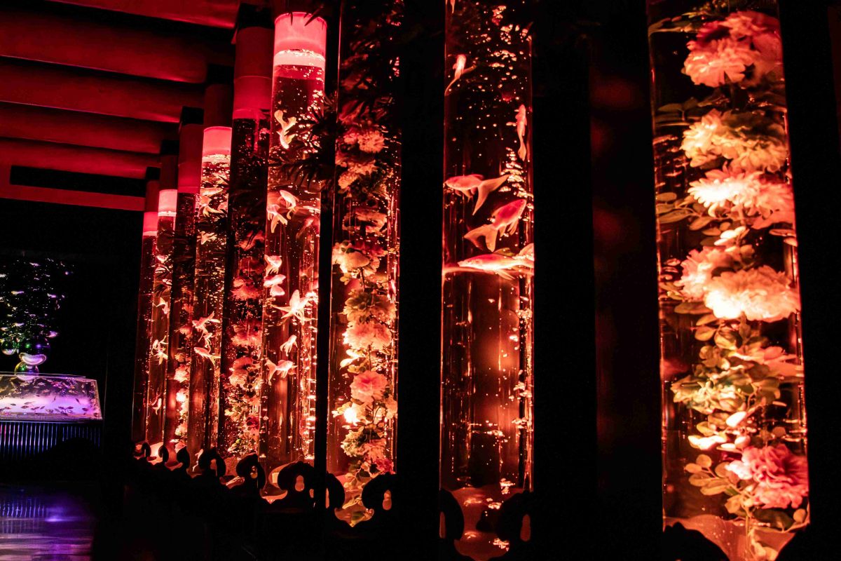 こちらの水槽は、金魚と花の柱が並ぶ参道がテーマ。光と色の変化で印象が変化していく様子は、非現実空間への入口に。鳥居をモチーフにした列柱の水槽群が連なる光景が華やかに演出されます。