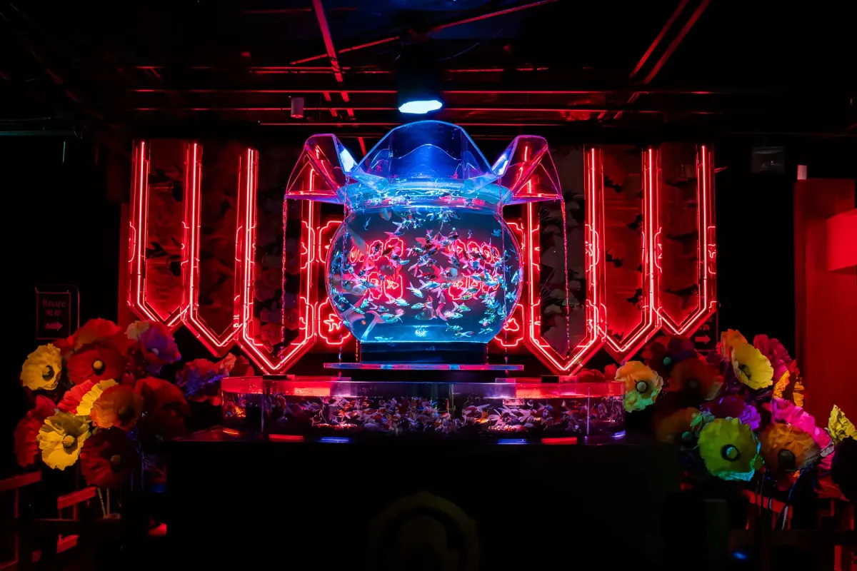 金魚が泳ぐ幻想的な空間に、ブランドの個性と創造性を融合させた「金魚×花の世界」をつくり上げています。冬に咲くことのない花たちが、水と光、そして金魚の命によって美しく息づく様子はまさに必見。金魚と花の調和によって生まれる鮮やかな世界を体感しましょう。