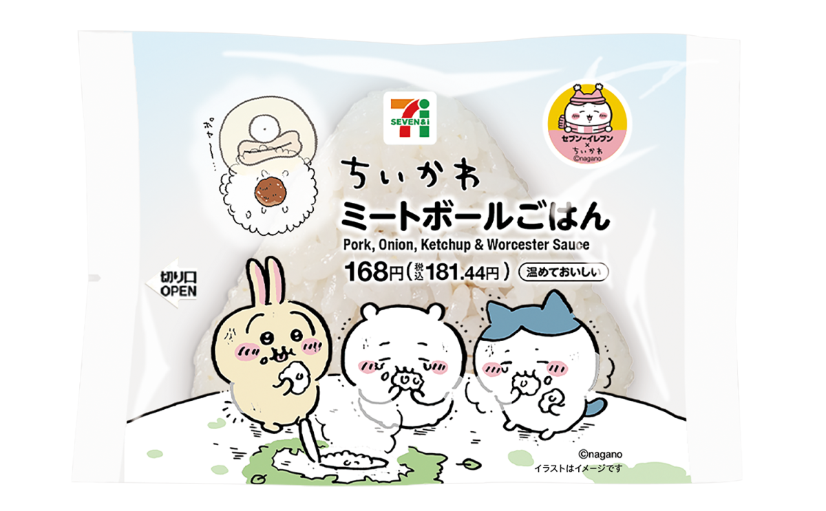 ゴブリンにつかまってしまったちいかわ、ハチワレ、うさぎが、脱走後に食べていたおにぎりを再現した一品。中を割ってみると、ミートボールがまるごと1個ドーンと入っていてテンションが上がります!