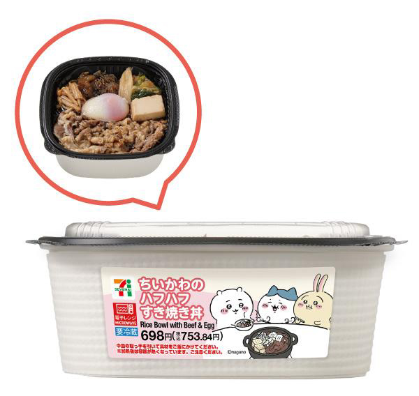 ちいかわが当選したすき焼きセットをイメージ。甘辛く味付けした牛肉と野菜に、温泉玉子をトッピングした贅沢な一品です。
