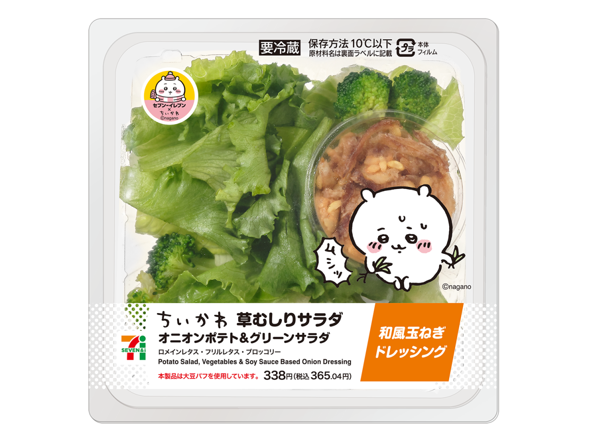 ちいかわが頑張って草むしりをしている姿をイメージ。オニオンポテトと3種の野菜が入った食べ応えのあるサラダです。