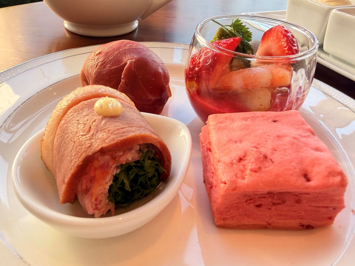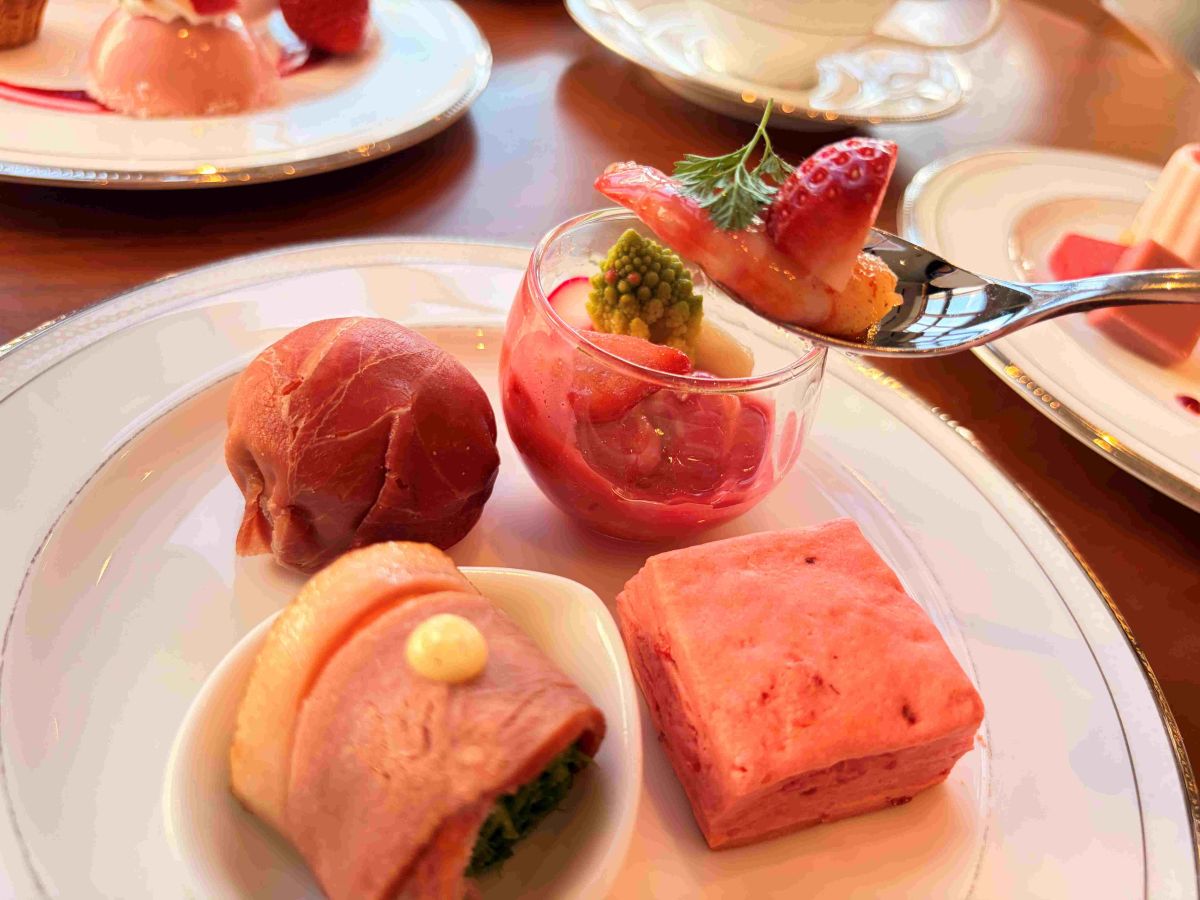 ベリーソースのほのかな酸味とシーフードのうまみが絶妙な「小海老・イタヤ貝のカクテル」、いちごの甘みとほどよい酸味がやさしく香る「いちごのスコーン」、スモークした鴨の香ばしさがアクセントの「スモーク鴨と香味野菜の生春巻き」など。