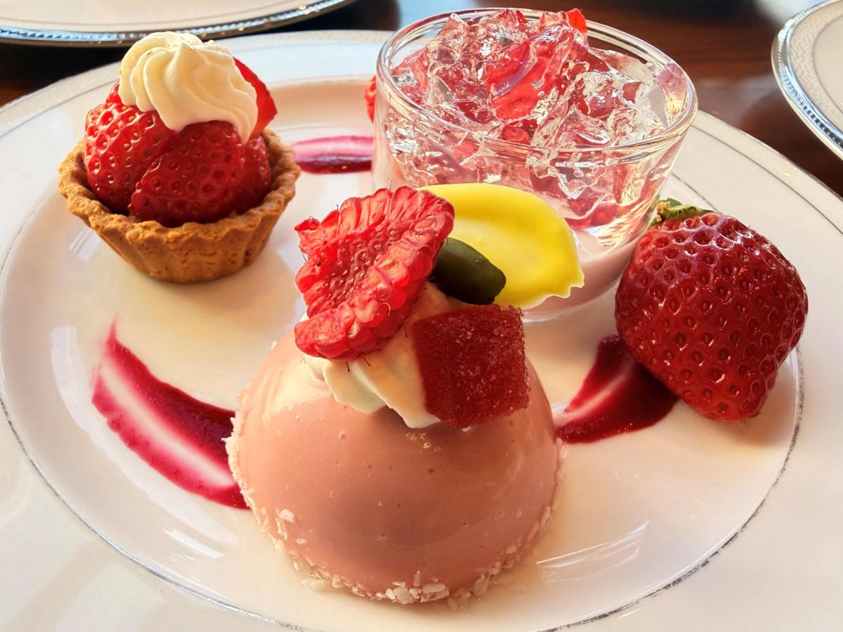 チーズのコクと、あまおうの甘酸っぱさが絶妙に溶け合う「あまおうレアチーズ」、あまおうとクリームを軽やかに包み込んだ「あまおうシュークリーム」、濃厚なピスタチオムースとジューシーなあまおうのゼリーを重ねた「フレジェ」など、バラエティ豊かなスイーツが並びます。“いちごの王様”の多様な魅力を余すところなく堪能できるひと皿。