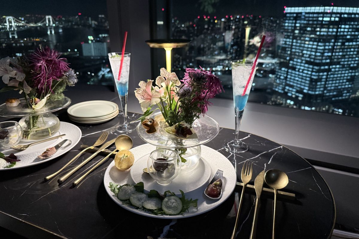今回は、地上150mの絶景を堪能しながら食事を楽しめるアニバーサリーコース「プレミアム記念日コース」をセレクト。国内外から仕入れた魚介をはじめ、山形豚や黒毛和牛など、さまざまな食材で特別な日を祝うことができます。
