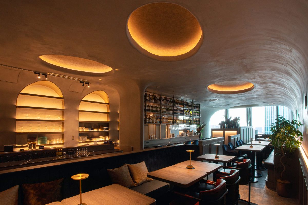 エレベーターを降りて左手に進むとすぐにレストランが現れます。店内へ入ると左手にはカウンター、右手にはテーブル席が。グレーを基調とした壁とゆるやかな曲線で、まるで洞窟に包み込まれたような感覚になります。