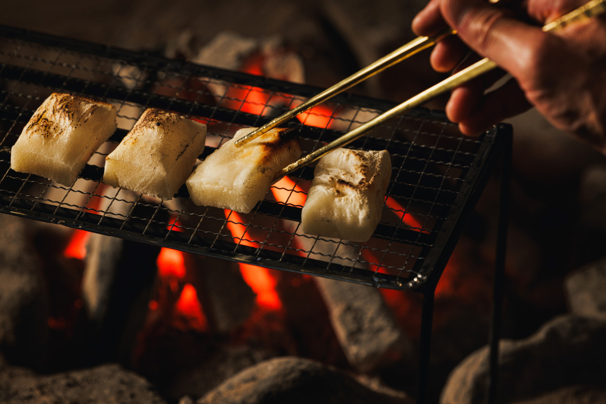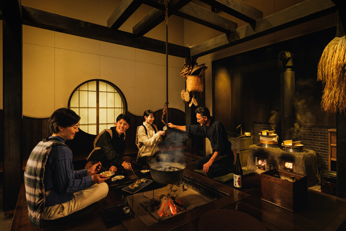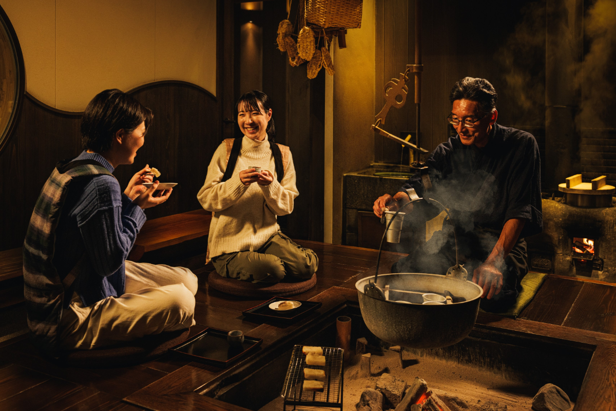 雪明かりに照らされた雁木の回廊の先に広がるのは、暖かな火が燃える囲炉裏の空間。ここでは、信州の寒い冬に重宝されてきた餅を囲炉裏の炭火で焼き上げる体験ができます。