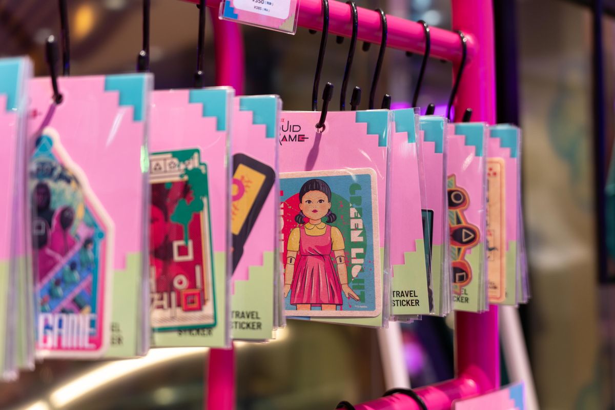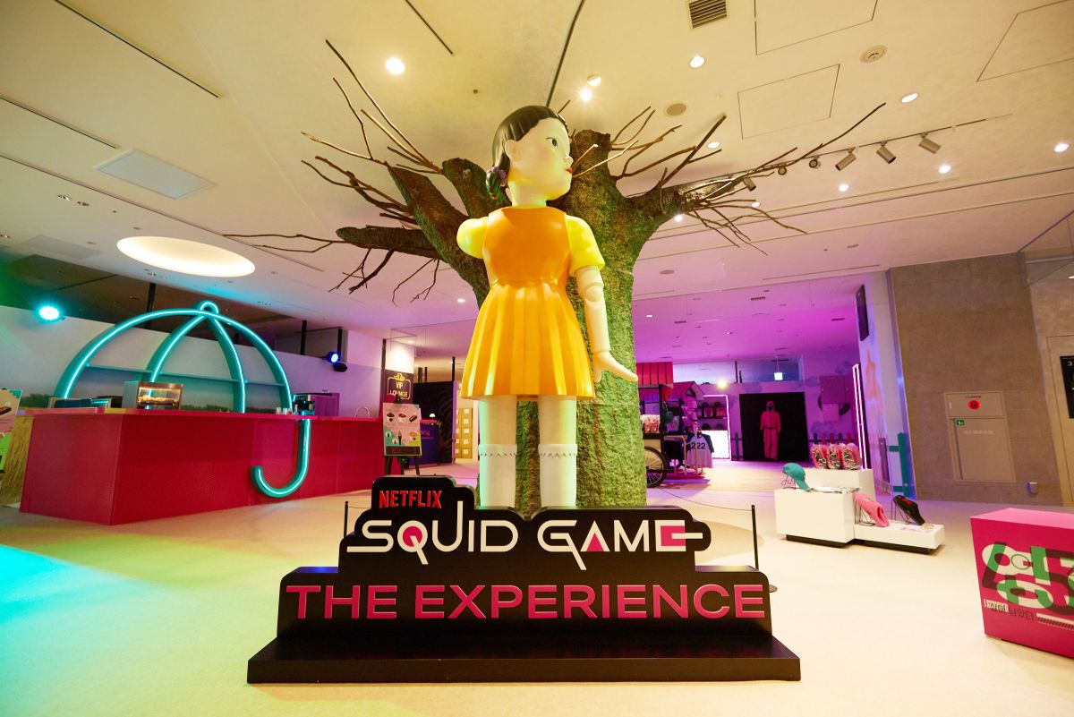 エントランス中央には、大きなヨンヒ人形が。こちらも作品で見たままの大迫力!目が合うのは怖いけれど、正面から見たい気持ちも…。一気に「イカゲーム」の世界観へと引き込まれます。