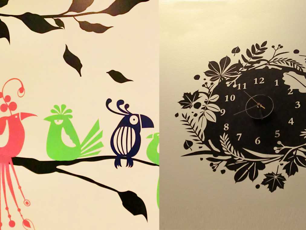 こちらはアート感覚で壁に貼ることができるウォールステッカー。写真左のようなポップな柄を殺風景な壁に貼れば、いっきに部屋の印象が変わりますね。写真右はウォールステッカーの上から時計をくっつけたアレンジバージョン。友安製作所では、店内のさまざまなインテリアがDIYの参考になります。