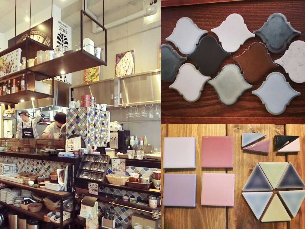 こちらは友安製作所が岐阜県の窯元に特注している美濃焼のタイル。和を感じさせるやさしい風合いです。タイルの裏には両面テープが付いているので、シールのようにペタッと貼るだけ!透明な養生テープの上から貼れば簡単にはがせるので、賃貸住宅への使用もOK。