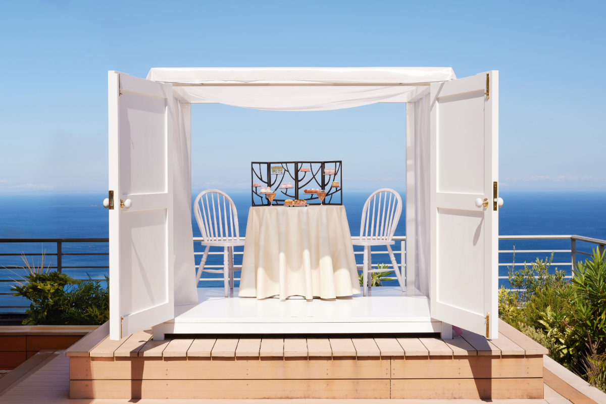 「梅ひらくアフタヌーンティー」の会場は、ホテル最上階のテラスに設えた1日2組限定の特等席。白い扉を開けると、淡いピンク色のドレープカーテンに包まれた華やかな空間が広がります。目の前の海と街並みを眼下に、アフタヌーンティーで少し早い春を感じ、ぜいたくなひとときを過ごせます。