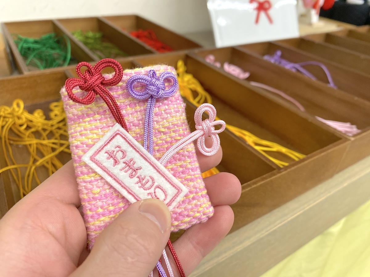 ヒモはすべて「二重叶結び(にじゅうかのうむすび)」とよばれる結び方。結び目の表裏が漢字の「口」の字と「十」の字に見えることから、「願いが叶う」という意味を持つそう。自分で作ったことで、縁起のよさもひとしおです!