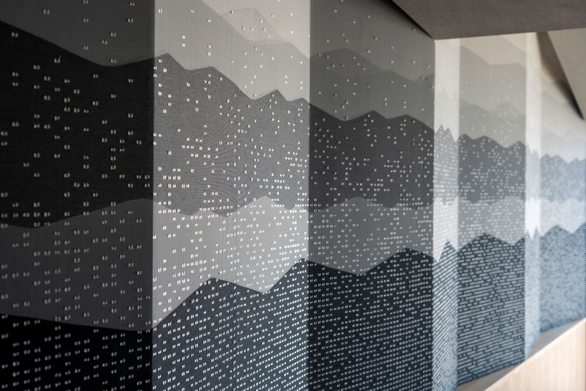 一番の特徴は壁面の布のアートで、雄大な山並みを背景に、温泉の湯けむりが立ち上る草津の情景を一枚の織物で表現。織物の色彩のグラデーションで山並みを、そこに絹糸を細かく刻んで湯けむりを表しています。繊細なアート作品をぜひ間近でも鑑賞してみてくださいね。