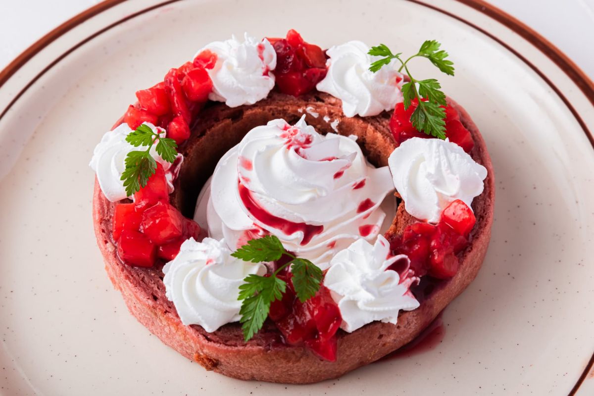 ブリュレ仕立てのワッフルに、イチゴやアイスクリーム、ベリーなどをたっぷりトッピング。