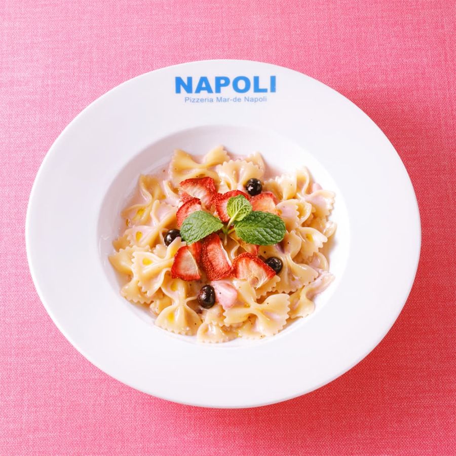 イチゴを使った斬新なパスタ! 蝶のような形状のショートパスタはかわいさ満点。