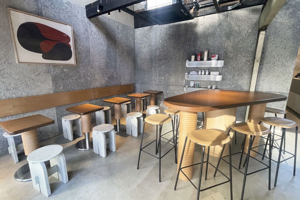内装はサステナビリティにこだわっています。壁は廃棄物を固めて作った木毛板で、テーブルはリサイクル性の高い木材。地球に優しく、未来を守るためのデザインとなっています。