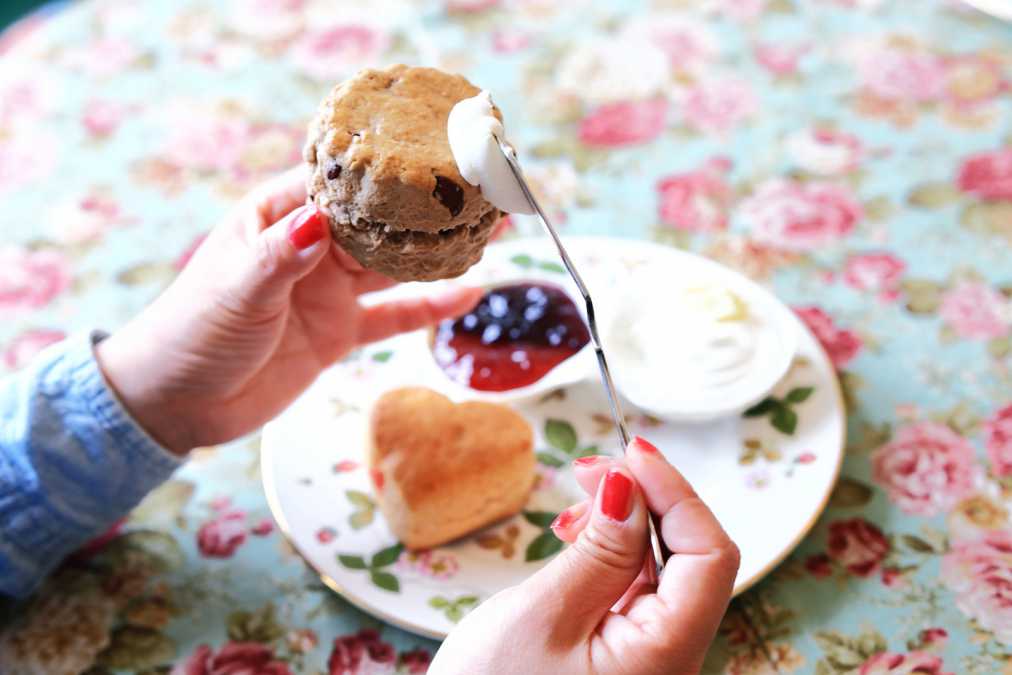 中段のオリジナルスコーンは全15種の中から好きなものを2つをチョイスできます。外はサクッ、中はしっとりのスコーンに生クリームやクロテッド・クリーム、ジャムをつけていただきます。