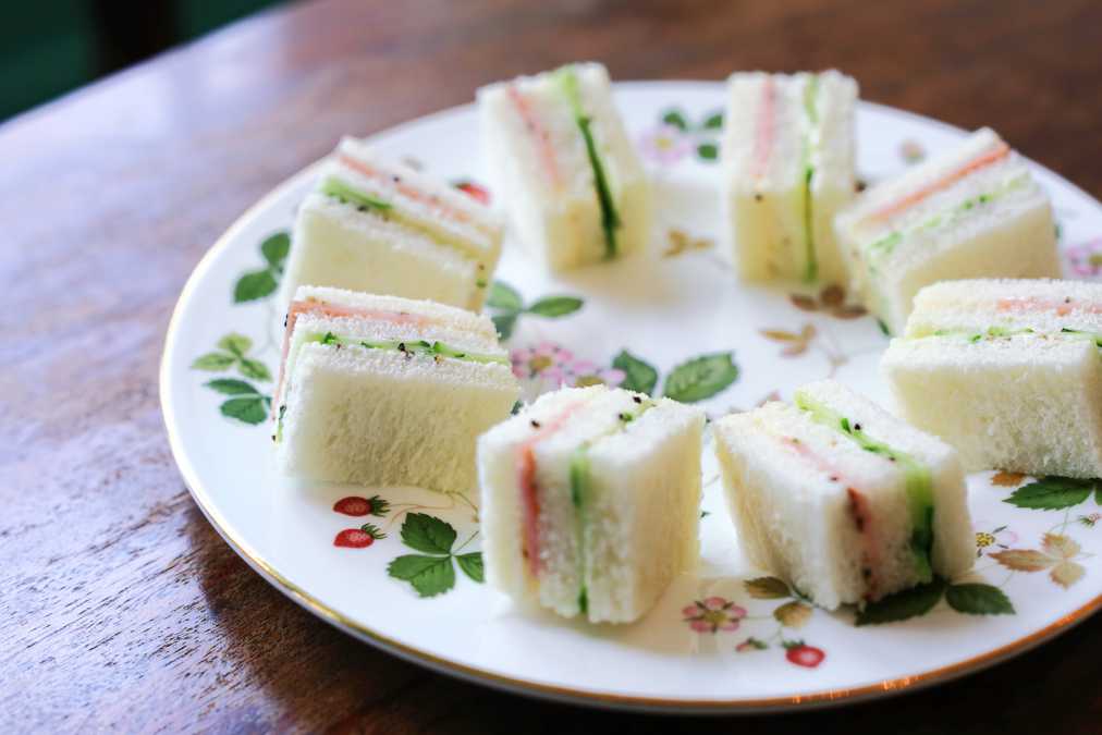 アフタヌーンティーは下のお皿から食べていくのがルール。下段はフィンガー・サンドイッチ。