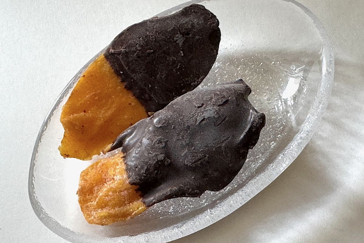 ドライマンゴーは、豊かな甘みとほどよい酸味が特徴のフィリピン産カラバオ種マンゴーを使用。果肉の約半分にダークチョコレートがコーティングされています。