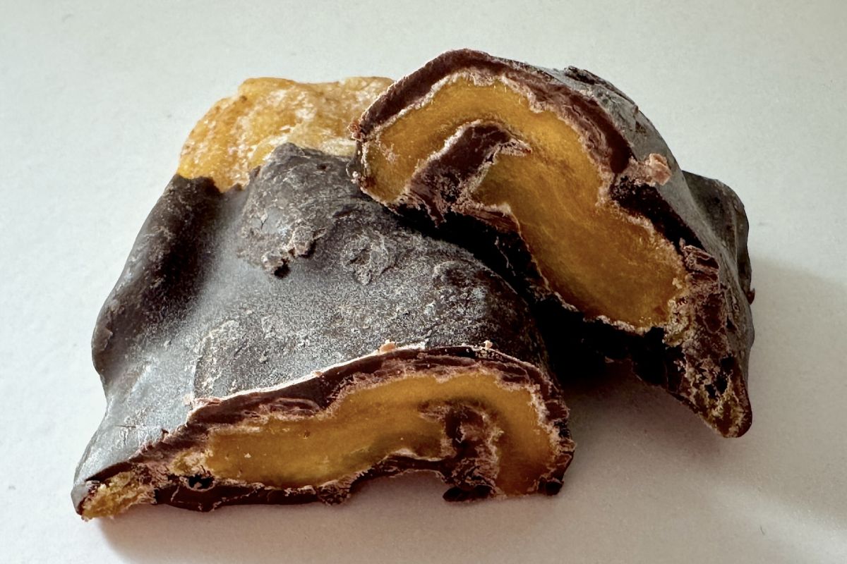 果肉の厚さや形状がひとつひとつ異なるのは、自然のものだからこそ。 果肉はしっとりとしていて滑らか。甘みと酸味のバランスがよく、甘さ控えめなダークチョコレートが、マンゴーのトロピカルな風味を引き立てています。
